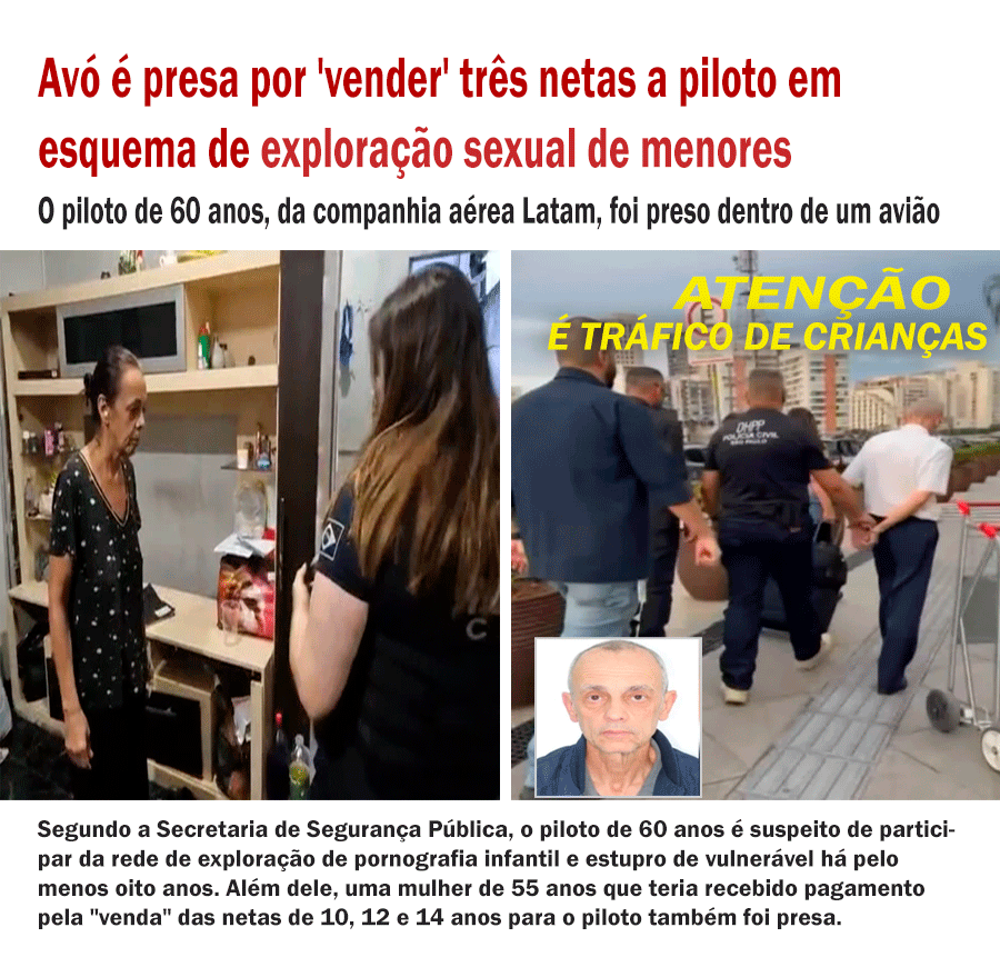 Segundo a Polícia Civil, a mulher teria recebido dinheiro do piloto em troca de permitir a exploração sexual das netas. O piloto, identificado como Sérgio Antonio Lopes, de 60 anos, foi localizado e preso durante o embarque de um voo. Ele é investigado por envolvimento, há pelo menos oito anos, em crimes relacionados à exploração sexual infantil e estupro de vulnerável.